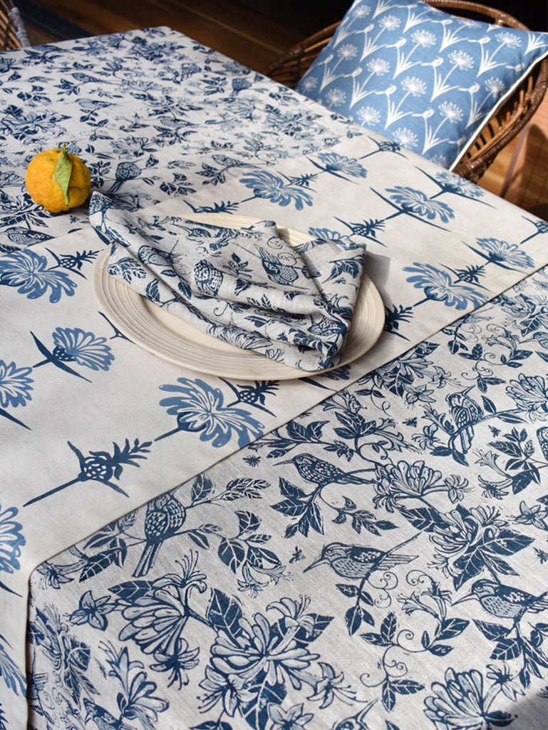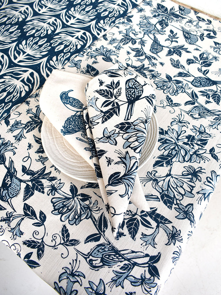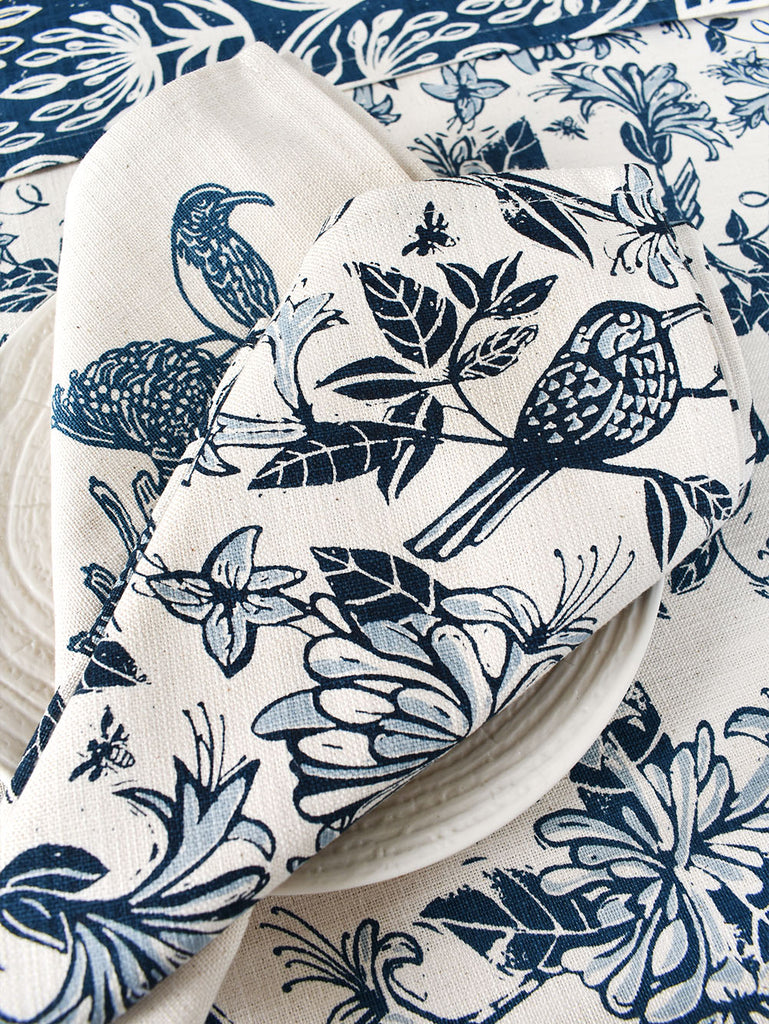 Bring artistry and tranquility into your kitchen with French Home’s Honeysuckle indigo napkins, designed by Carole Nevin. Handcrafted from 100% cotton twill, this set of four napkins features a lively natural botanical print of blooming honeysuckle intertwined with enchanting Cape sugarbirds. Shades of indigo and blue come together in a structured floral motif creating a look that is timeless and serene. Each napkin is handprinted and crafted by skilled artisans resulting in subtle variations. Perfect for gifting or adding a refined touch to your table.
