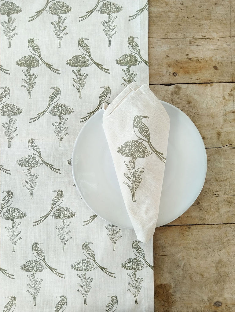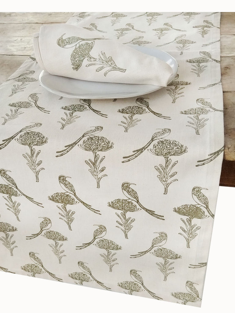 Bring artistry and tranquility to your table with French Home’s Sugarbird table runner, designed by Carole Nevin. Handcrafted from 100% cotton twill, this runner features the enchanting Cape sugarbird delicately perched on South Africa’s bold and beautiful pincushion flower in a tranquil shade of muted sage. Each table runner is carefully handprinted and crafted by skilled artisans resulting in subtle variations. Perfect for gifting or adding a refined touch to your table.