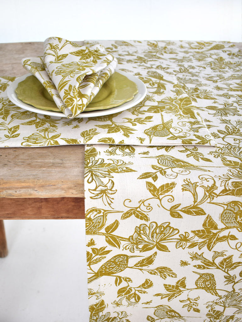 Bring artistry and tranquility into your kitchen with French Home’s Honeysuckle chartreuse table runner, designed by Carole Nevin. Handcrafted from 100% cotton twill, this runner features a lively natural botanical print of blooming honeysuckle intertwined with enchanting Cape sugarbirds. The fresh chartreuse palette and structured floral design create a look that is timeless and serene. Each table runner is handprinted and crafted by skilled artisans resulting in subtle variations. Perfect for gifting or adding a refined touch to your table.