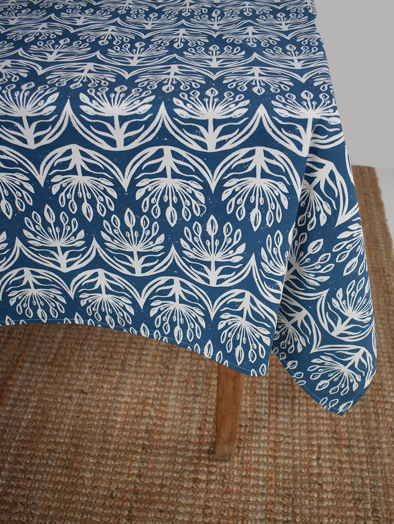 Bring artistry and tranquility to your dining table with French Home’s Botanical indigo tablecloth, designed by Carole Nevin. Handcrafted from 100% cotton twill, this tablecloth features a crisp white floral motif that stands out beautifully against the deep indigo background, creating a look that is timeless and serene. Each tablecloth is handprinted and crafted by skilled artisans resulting in subtle variations. Perfect for gifting or adding a refined touch to your table.