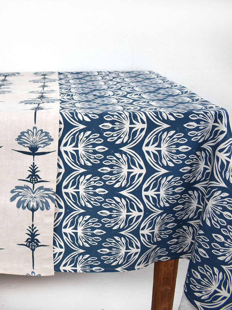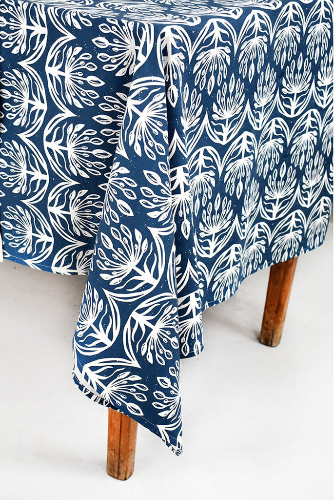 Bring artistry and tranquility to your dining table with French Home’s Botanical indigo tablecloth, designed by Carole Nevin. Handcrafted from 100% cotton twill, this tablecloth features a crisp white floral motif that stands out beautifully against the deep indigo background, creating a look that is timeless and serene. Each tablecloth is handprinted and crafted by skilled artisans resulting in subtle variations. Perfect for gifting or adding a refined touch to your table.