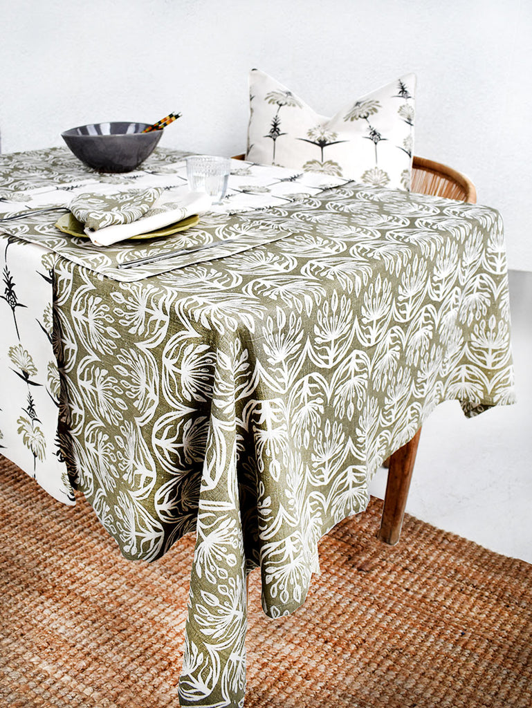 Bring artistry and tranquility to your dining table with French Home’s Botanical sage tablecloth, designed by Carole Nevin. Handcrafted from 100% cotton twill, this tablecloth features a soft white floral motif that stands out beautifully against the muted sage background, creating a look that is timeless and serene. Each tablecloth is hand-printed and crafted by skilled artisans resulting in subtle variations. Perfect for gifting or adding a refined touch to your table.